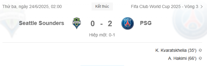 Trên sân Lumen, trước sự chứng kiến của 50.628 người hâm mộ, PSG hoàn toàn áp đảo khi kiểm soát bóng 73%, dứt điểm 15 lần với 7 cú trúng đích – so với 7 và 0 của Seattle Sounders. Nhà vô địch Champions League ghi hai bàn nhờ công Khvicha Kvaratskhelia, Achraf Hakimi để cán đích đầu bảng. Họ sẽ gặp đội nhì bảng A trên sân Mercedes-Benz ở Atlanta, vào lúc 23h Chủ nhật 29/6 giờ Hà Nội.